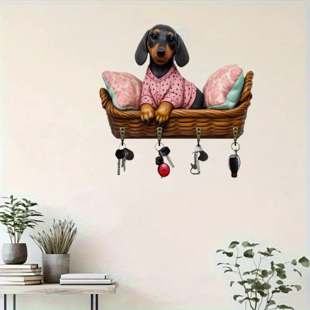 2D Wooden Multi-Functional Dachshund Key Holder with Four Metal Hooks For Home Decor