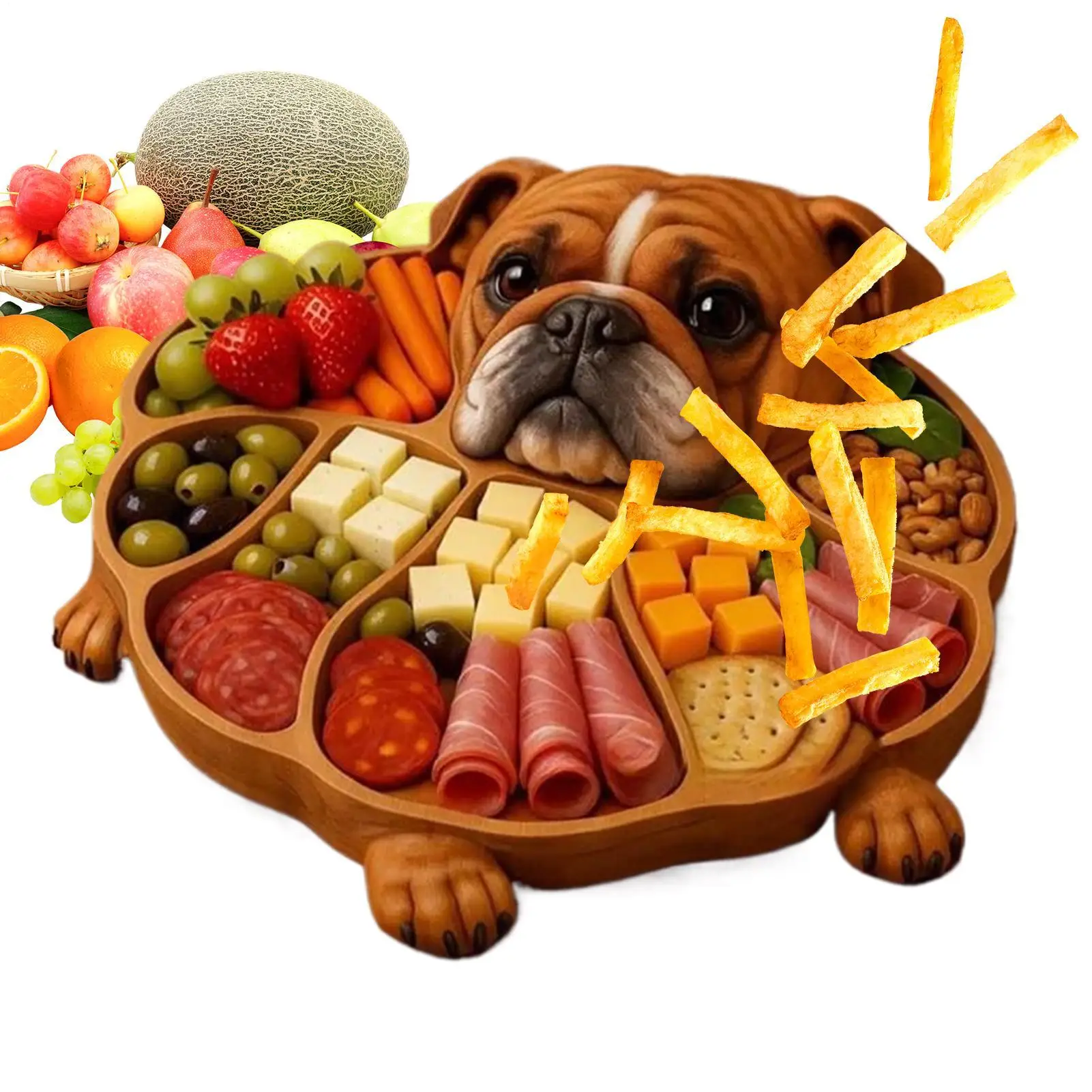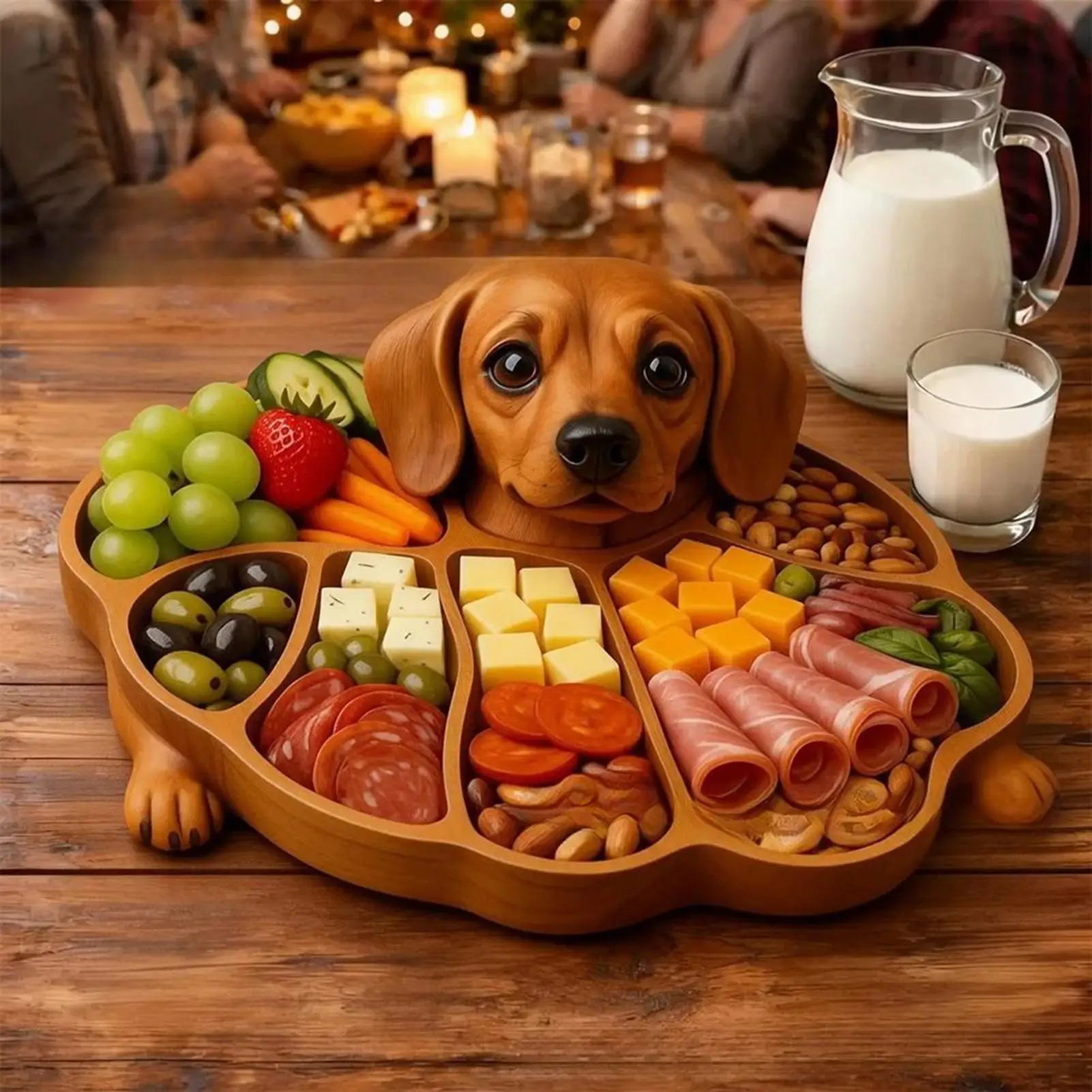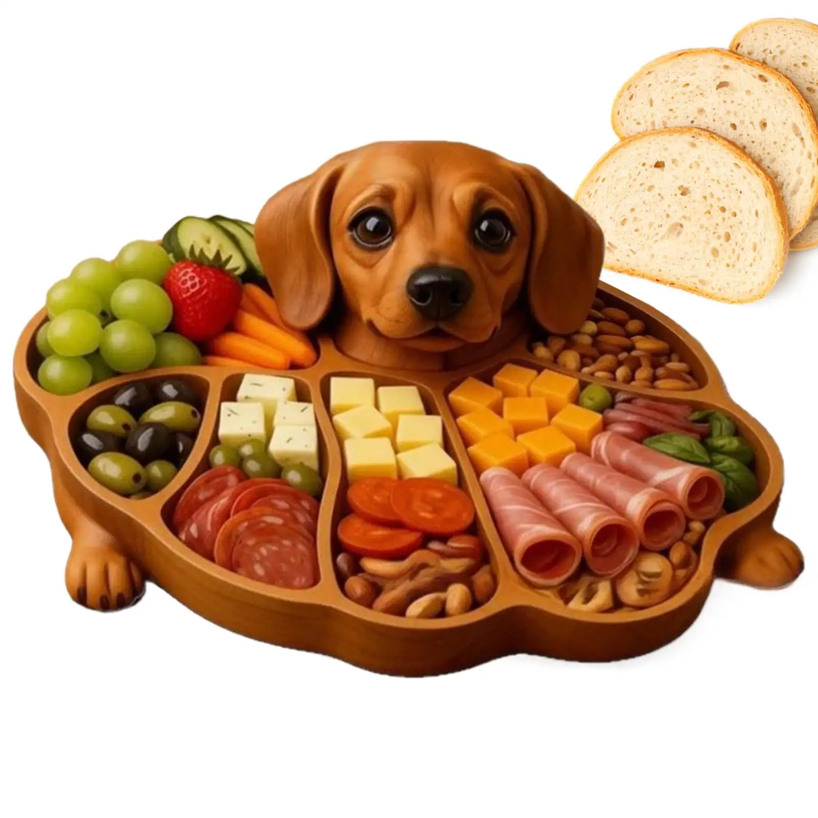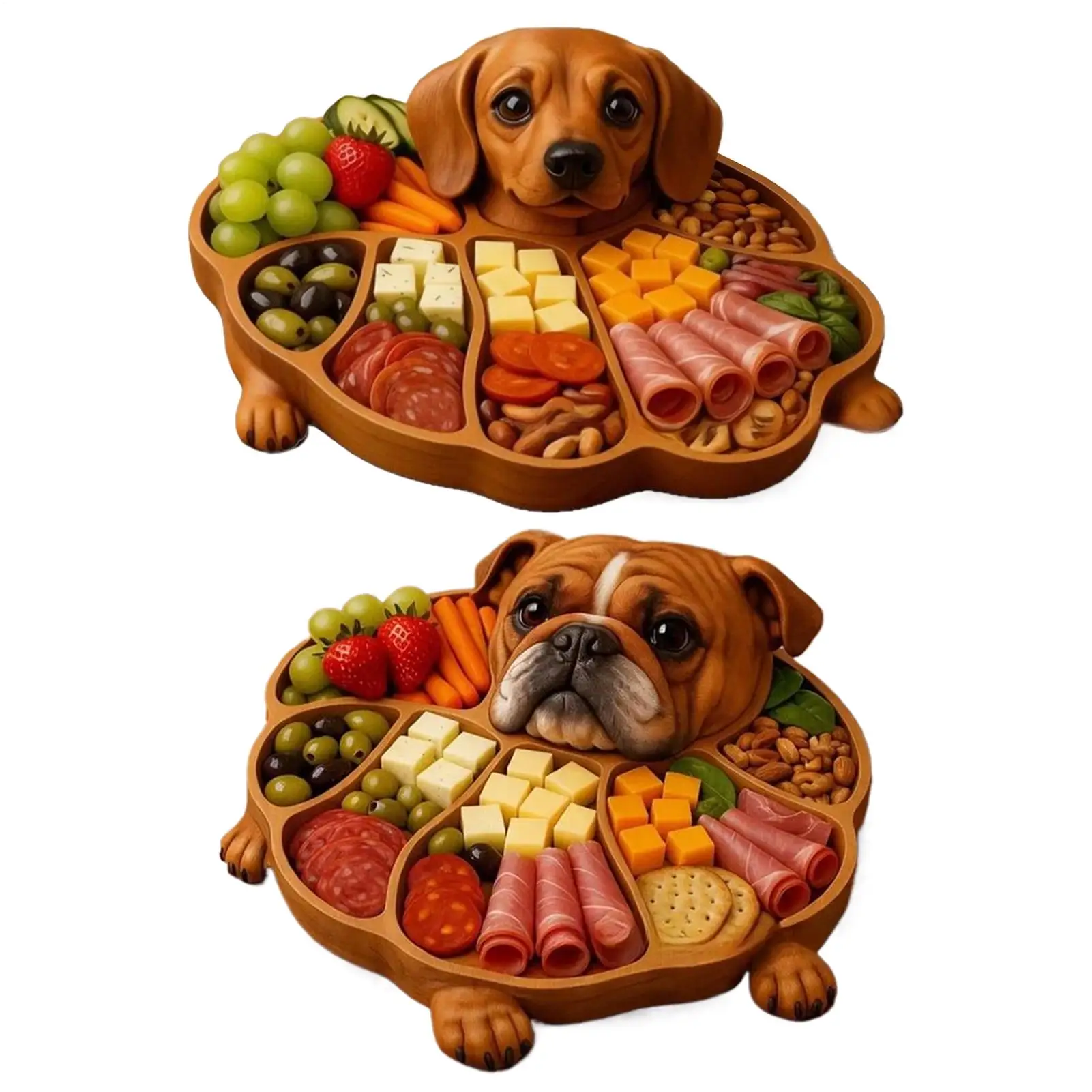 1. Engaging Serving Solution: The wood serving tray's funny dog-shaped carving enhances dining experiences, offering an artistic yet functional way to serve food while adding comfort and joy to family gatherings, ideal for everyday use or celebrations2. Stylish Daily Entertaining Must-Have: The wooden serving trays feature an ingenious compartment design that ensures cheese, fruit, and snacks remain tidy and accessible, providing a refined way to handle multi-category serving needs during casual or formal entertaining occasions