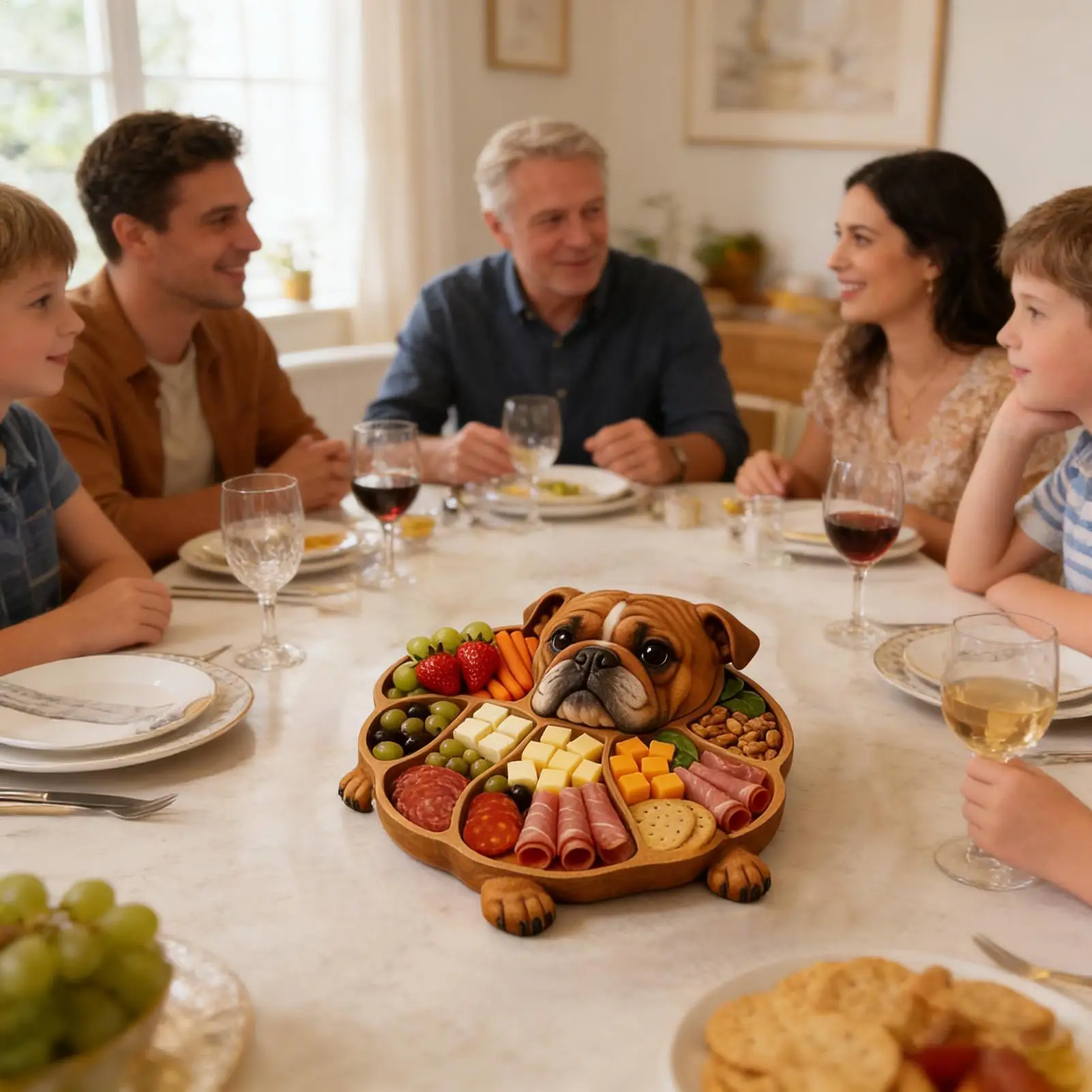 The Cheese Board Divided Serving Tray is an elegant addition to your serveware collection, designed to enhance your dining and entertaining experience. Featuring a multi-compartment layout, this tray allows you to display cheese, meat, sausage, fruit, candy, biscuits, snacks, and desserts in an organized manner. Its animal-inspired design, including a dog theme, adds charm to any table decor, making it perfect for home, apartment, kitchen, or living room use. Ideal for parties, holidays, and housewarming events, this serving tray combines functionality with aesthetic appeal. Use it to create a stunning charcuterie board or as a centerpiece for gatherings, while enjoying its practicality and style. This versatile tray ensures your food presentation stands out, effortlessly blending utility with visual allure.